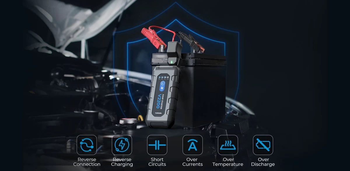 Διαθέτει πλήθος χαρακτηριστικών ασφαλείας. Το V2200 προστατεύει τους χρήστες από ηλεκτρικούς κινδύνους, συμπεριλαμβανομένων σπινθήρων από την επαφή με τους σφιγκτήρες των καλωδίων. Το εργαλείο διαθέτει επίσης την αναγνωρισμένη στιβαρότητα της σειράς JumpSurge της TOPDON. Η ανθεκτικότητα σε πτώσεις, σκόνη και νερό καθιστά το εργαλείο αξιόπιστο σε οποιεσδήποτε συνθήκες.