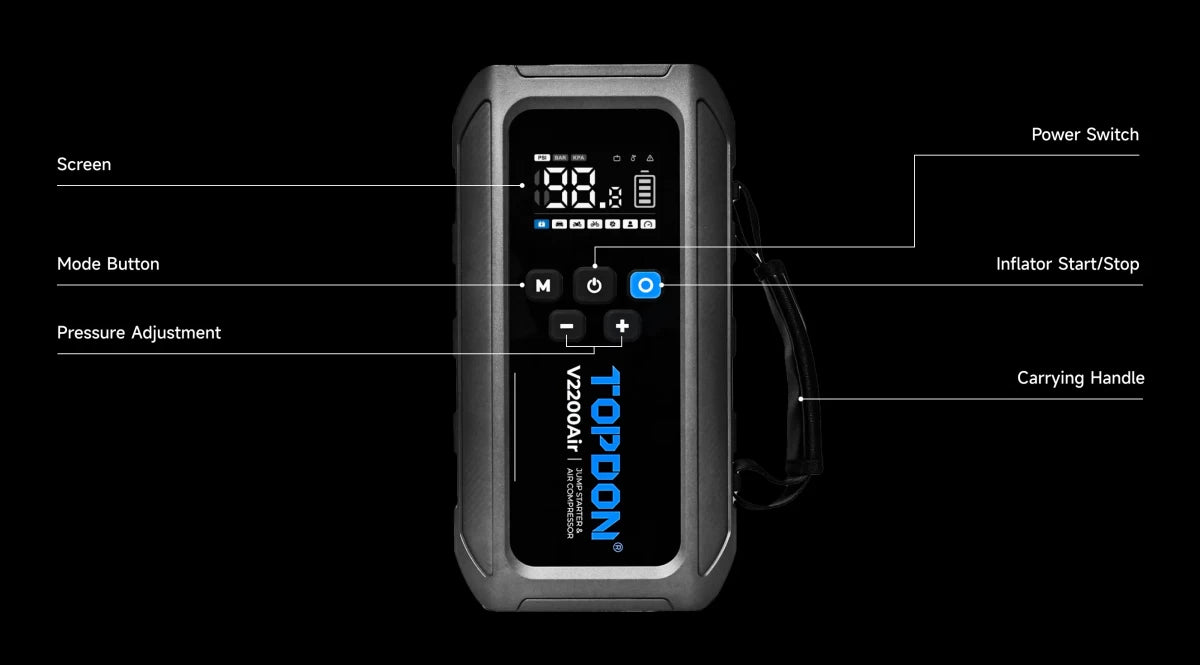 Παρουσιάζουμε το V2200Air, την απόλυτη λύση «όλα σε ένα» για τις έκτακτες ανάγκες κάθε ιδιοκτήτη αυτοκινήτου. Αυτή η ευέλικτη συσκευή σάς επιτρέπει να εκκινήσετε γρήγορα το αυτοκίνητό σας, να φουσκώσετε τα ελαστικά σας, να φορτίσετε τις συσκευές σας και να φωτίσετε τον περιβάλλοντα χώρο με ευκολία. Μείνετε προετοιμασμένοι για κάθε κατάσταση και οδηγήστε με σιγουριά, γνωρίζοντας ότι το V2200Air σας καλύπτει.