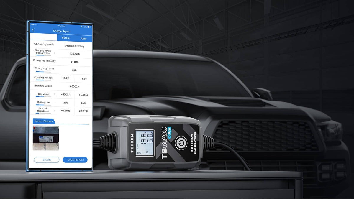 Το TOPDON TB6000Pro προσφέρει για πρώτη φορτά στον κλάδο λειτουργία έξυπνης φόρτισης, η οποία μπορεί να εμφανίσει μια αναφορά πριν και μετά τη λειτουργία παρουσιάζοντας ακριβή σύγκριση δεδομένων. Στη λειτουργία έξυπνης φόρτισης, το TB6000Pro θα εκτελέσει αυτόματα μια προανίχνευση της μπαταρίας μόλις ξεκινήσετε να τη φορτίζετε και θα σας επιτρέψει να δοκιμάσετε ξανά την μπαταρία με τη λειτουργία «Προβολή αναφοράς» για να δημιουργήσετε μια αναφορά πριν και μετά. Συγκρίνοντας τα δεδομένα, όπως CCA, εσωτερική αντίσταση, τάση, κατάσταση εύρυθμης λειτουργίας, η αναφορά δείχνει σαφώς πόσο βελτιώθηκε η μπαταρία μετά τη φόρτιση. Μπορείτε επίσης να αποθηκεύσετε τις αναφορές δοκιμών σε φωτογραφίες για προβολή ανά πάσα στιγμή.