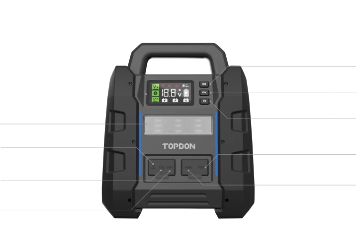 Το V4500 Plus βελτιώνει επίσης την οδηγική σας εμπειρία, με χαρακτηριστικά όπως η δοκιμή και η παρακολούθηση της μπαταρίας μέσω της εφαρμογής μας, η εξαιρετικά ταχεία φόρτιση του smartphone σε 25 λεπτά και ένας φακός με φωτεινότητα 500 lumen από 15 εξαιρετικά φωτεινές λυχνίες LED και έξι κόκκινες προειδοποιητικές λυχνίες. Προετοιμαστείτε και παραμείνετε ασφαλείς στον δρόμο με την TOPDON.